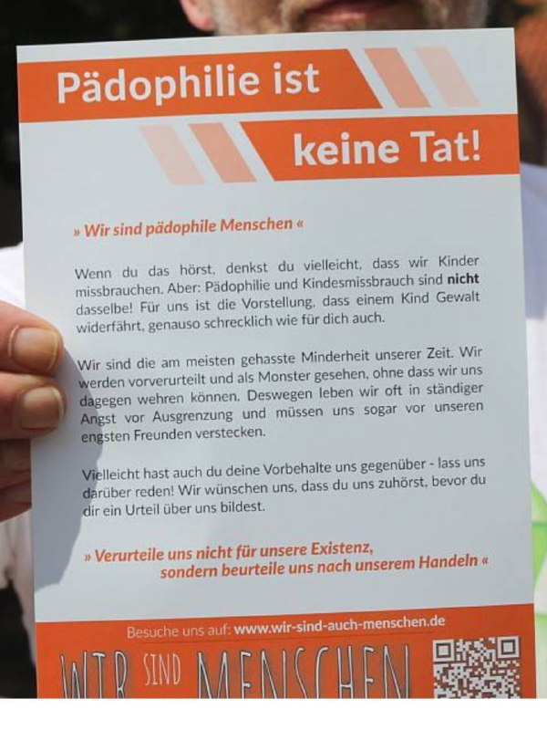 Die Neue Westfälische titelt mit der Frage „Wie kann die Gesellschaft mit Pädophilie umgehen?“ und zeigt auf einem Bild einen Flyer der sich liest als wolle man Pädophilie gesellschaftsfähig machen. Interessanterweise werden Pädophile und Opfer unter dem Begriff „Betroffene“ zusammengefasst.